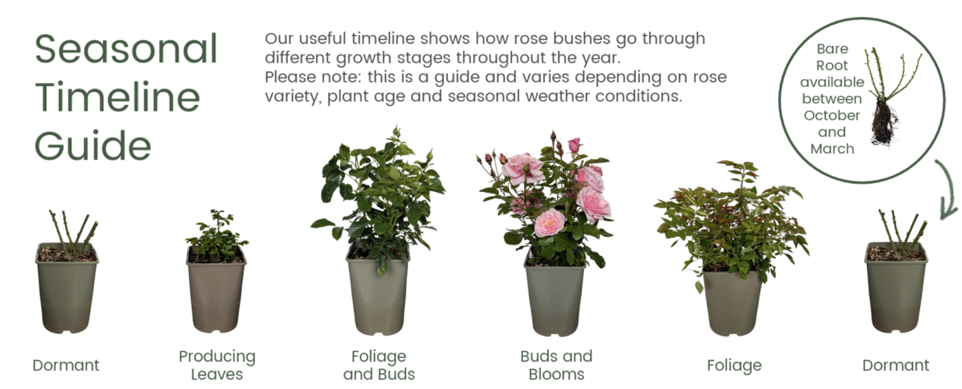 While our roses are still resting in their winter dormancy around Valentine’s Day, the wait for their beautiful blooms won’t be long! With spring just around the corner, now is the perfect time to gift a rose to someone special. The anticipation of watching it come to life and bloom in the months ahead adds a unique, heartfelt touch to your gift. See our seasonal timeline diagram below for a better idea of how you can expect your rose to look throughout the year.