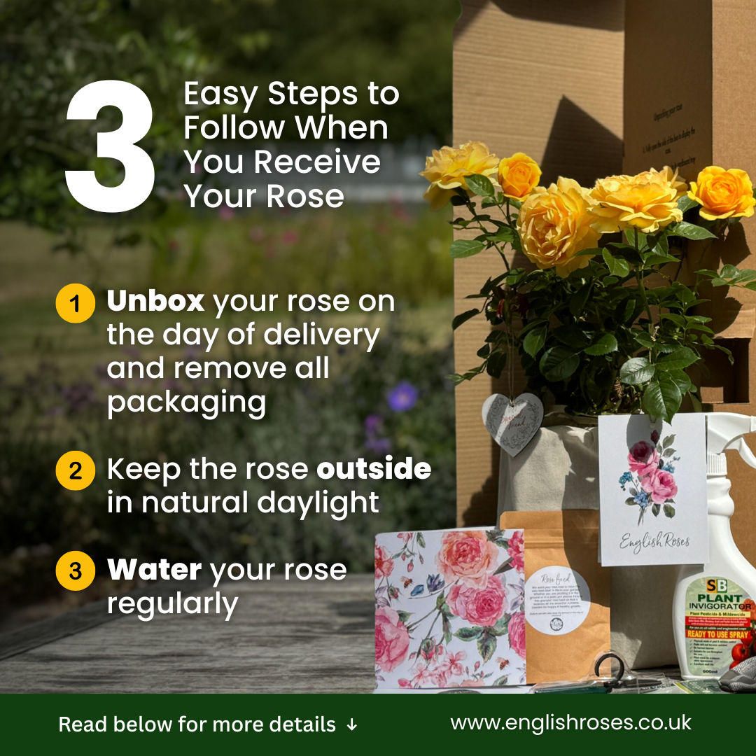 - Place your rose outside in natural daylight (keep outside all year round, never keep your rose inside)
