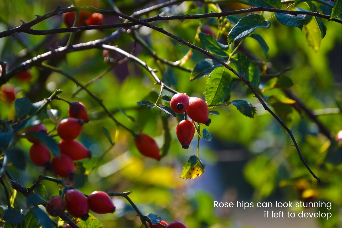 After the flowers have faded, the Rose plant grows a fruit (or seed pod) called a “hip”. We often don’t see these as most rose growers prune down the rose to encourage more flower growth, and to stop the rose from using energy growing hips. However, most rose plants will produce hips if left to their own devices, and these can be stunning in themselves. In particular, rambler roses that have been grown through hedging or trees look eye catching with the small bright fruits showing through the greenery.