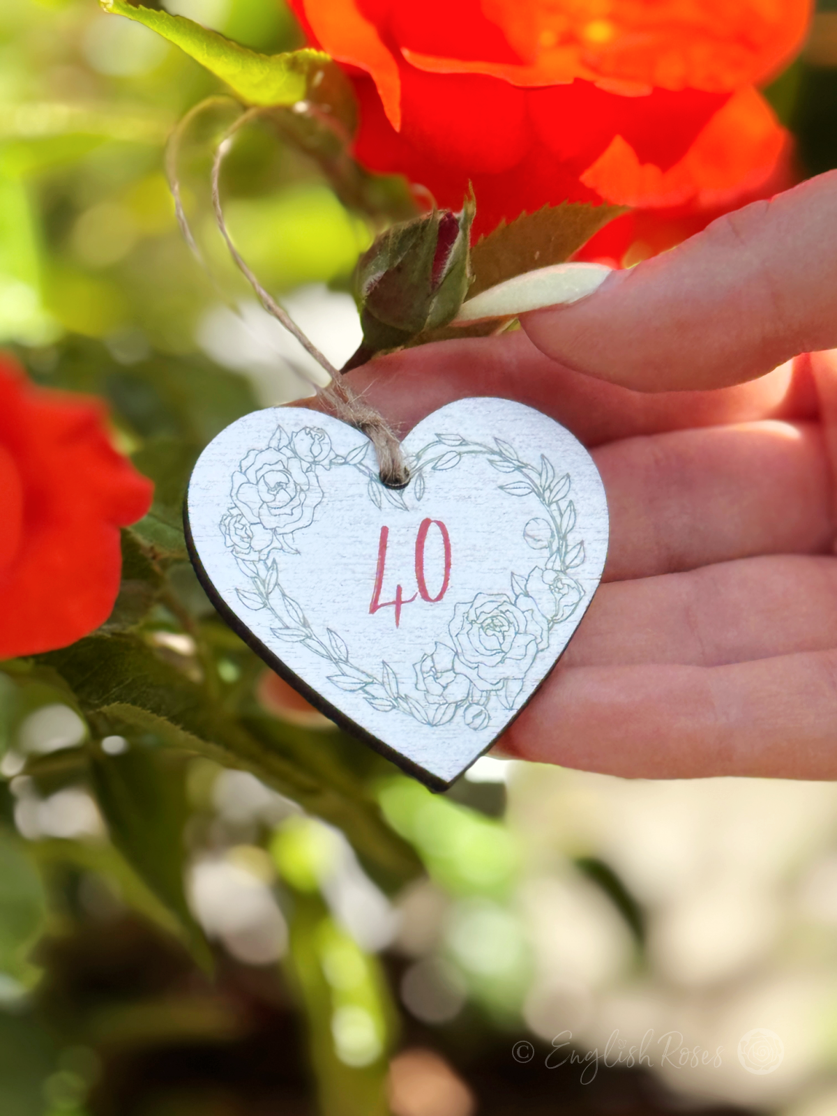 Wooden gift tag with “40” in red lettering and green decorative rose border. Heart shaped, approx 5cm. Natural jute twine hanger.