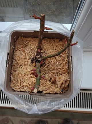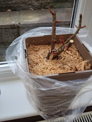 As spring arrives and the weather warms, roses will be emerging from dormancy and starting to grow. Their stems will have been lightly pruned to encourage new growth, and leaves may start to appear. Roses grow at different rates, depending on variety, age, and weather conditions. Roses still need to be kept outside even if the temperatures fall.