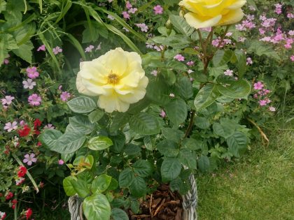The Golden Bouquet Rose is a stunning floribunda variety. The large flowers are a bright yellow when they first open, fading to a delicate cream as they age. The semi-double blooms are cup shaped and beautifully formed, thus creating a wonderful display. With a fantastic strong, sweet scent, this rose is sure to be a favourite.