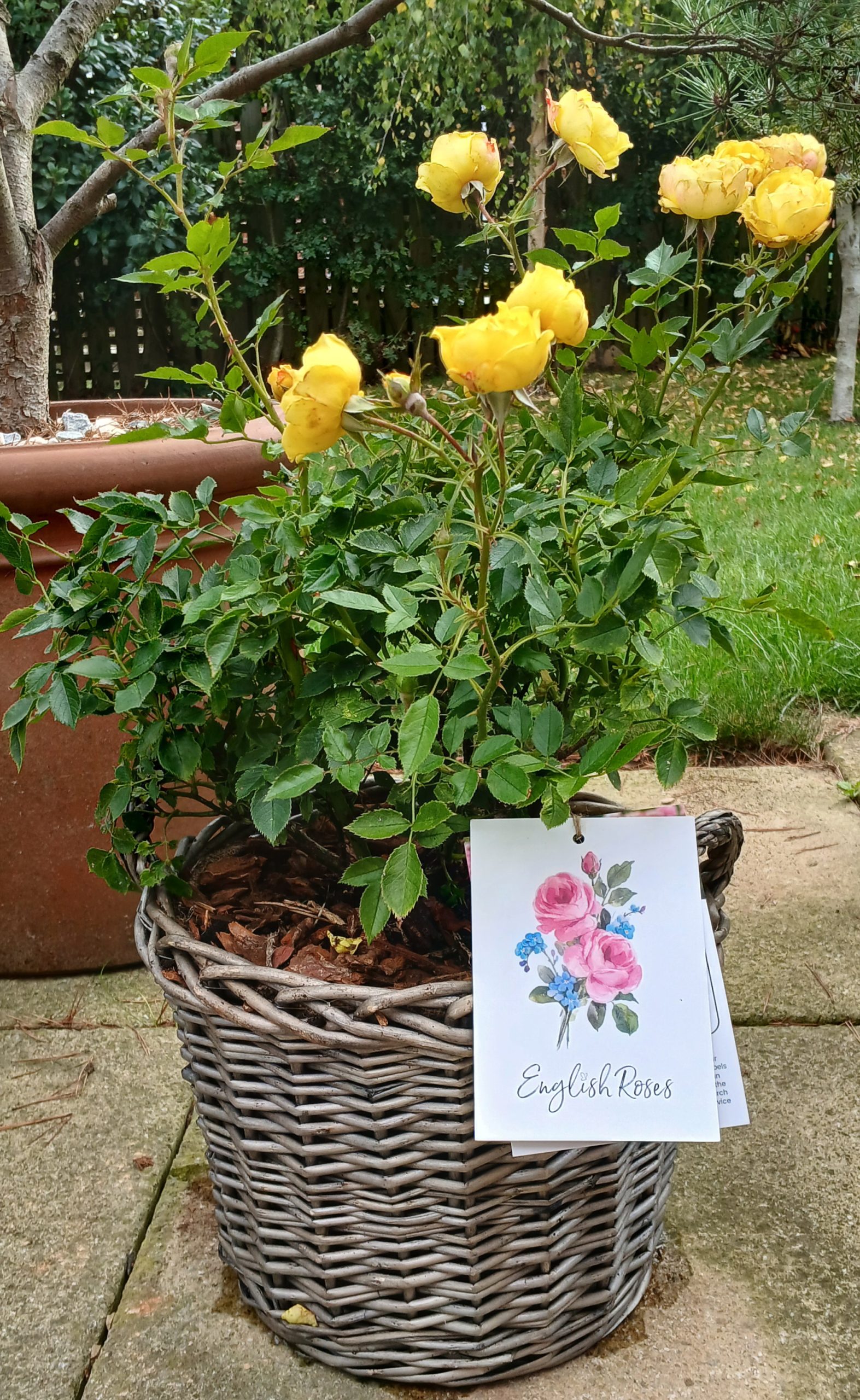 Can I get my Golden Wishes Rose planted in a container? All our potted roses are in large 5.5L recyclable pots, or you can choose to have your Golden Wishes Rose planted into our beautiful willow basket ready for gifting.