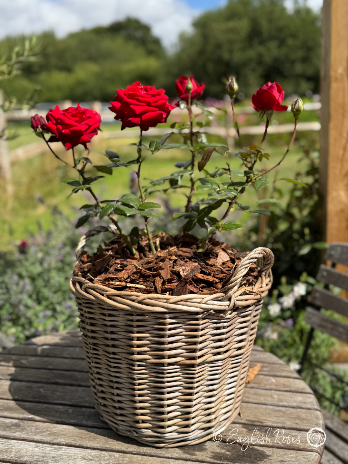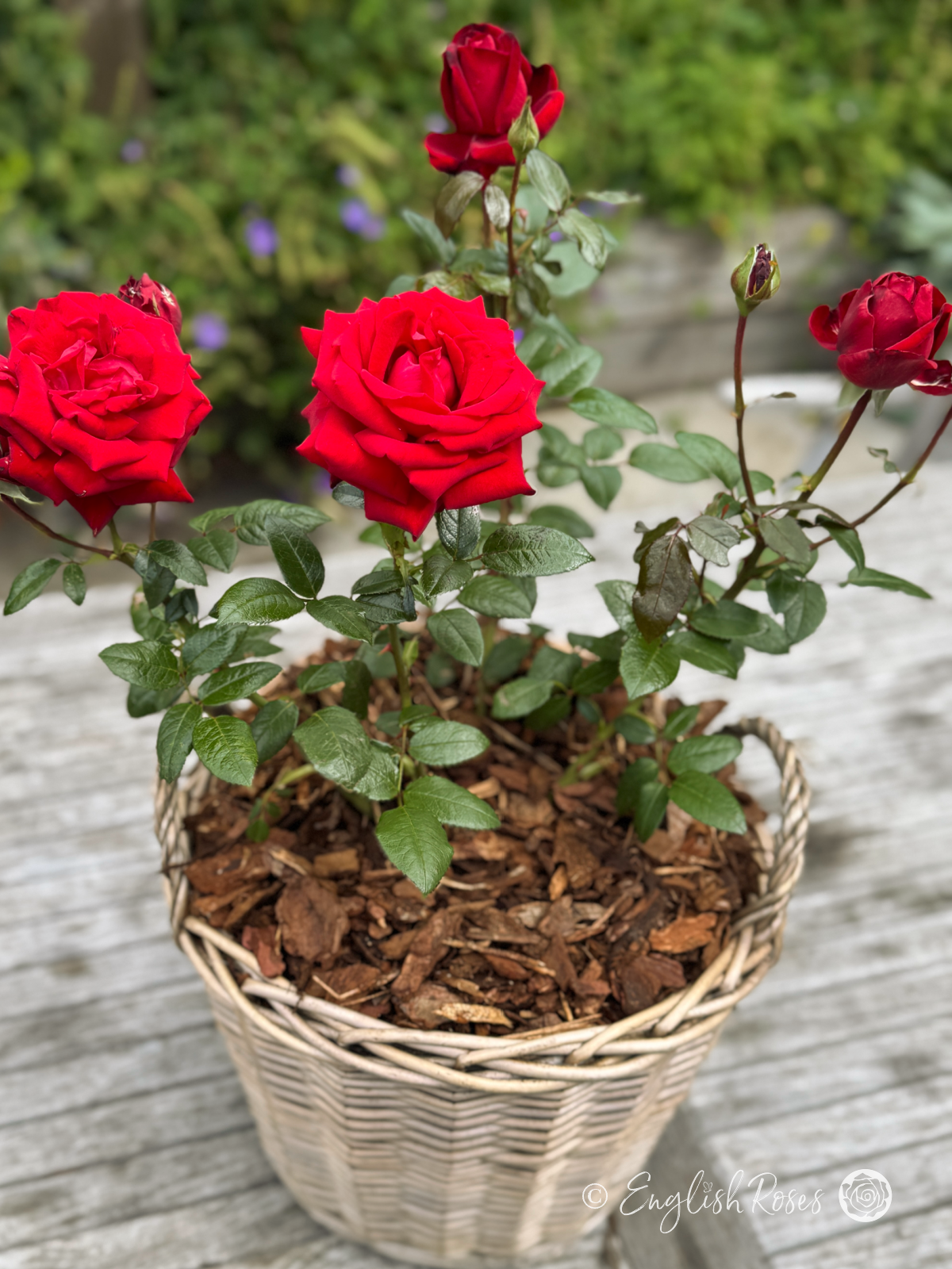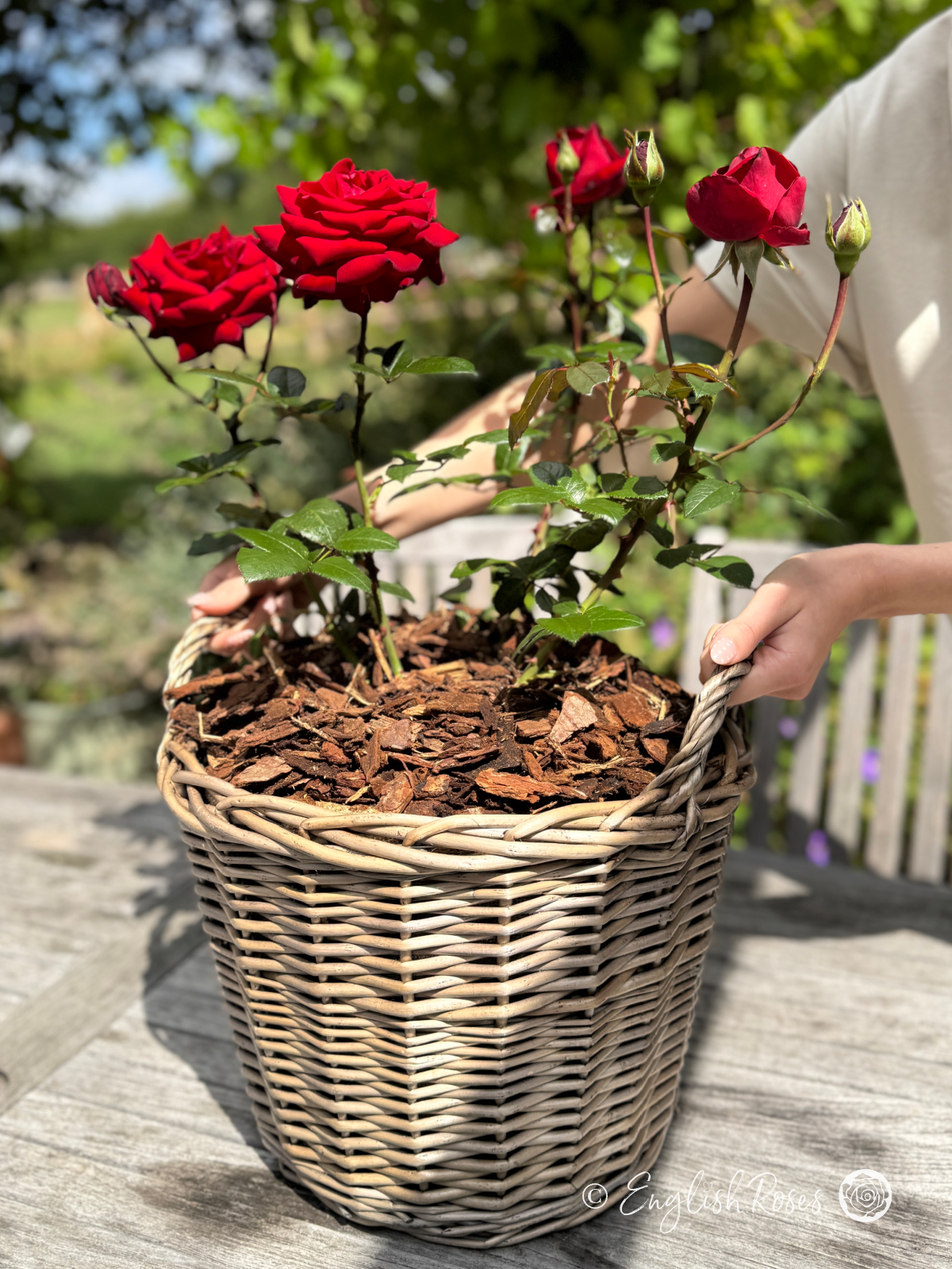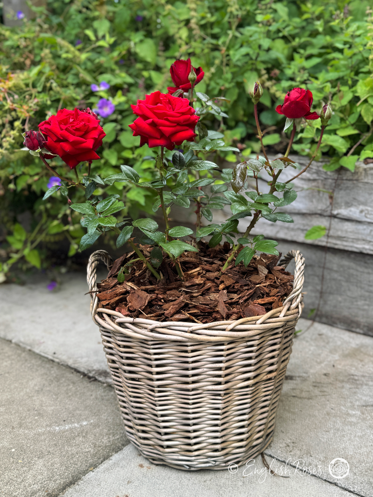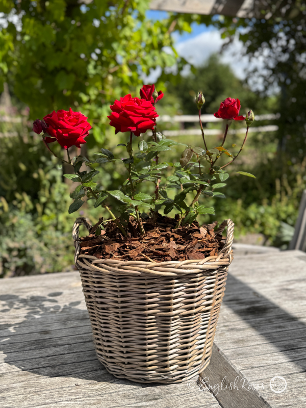 Expertly planted in our exclusive large willow basket, your rose will be ready to bring instant colour to the garden! We nestle your rose in approximately 14L of high-quality fresh compost and premium slow-release fertiliser, providing all the nutrients that make our roses so stunning. Finished with a bark topping to aid water retention and suppress weeds, it also gives a gift-ready finish. At approx 14L, this large basket can therefore provide all your rose needs for up to 2 years with no replanting necessary, making it the perfect hassle-free anniversary rose!