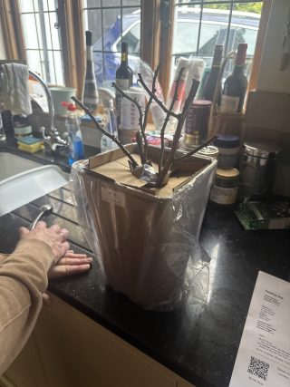 Obviously in its dormant stage, but the rose arrived very well packaged and I can already see new buds forming. The care instructions provided meant to was very easy to repot and know how to take care of it. I also ordered a Willow basket from English Roses to repot it in, which came within one day of ordering, and on Xmas Eve!